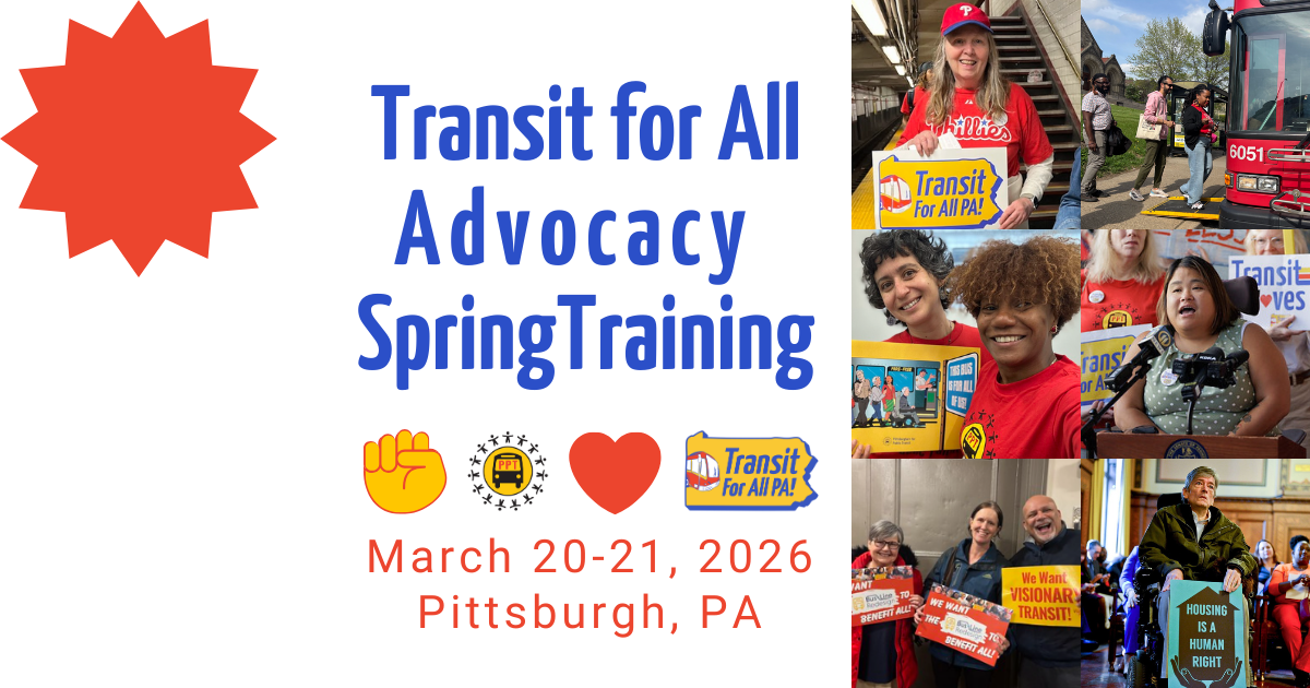 Get your tickets today! Join riders and workers from across the state and country at the Transit for All Advocacy Spring Training, March 20th and 21st in Pittsburgh, PA!