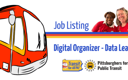 image description: illustration of a red bus to the left of the image, small photo of smiling supporters to the right, text reads “Job listing Digital Organizer – Data Lead” with logos for Transit for All PA! and Pittsburghers for Public Transit. The movement is hiring a new staff position! Check out the description below […]