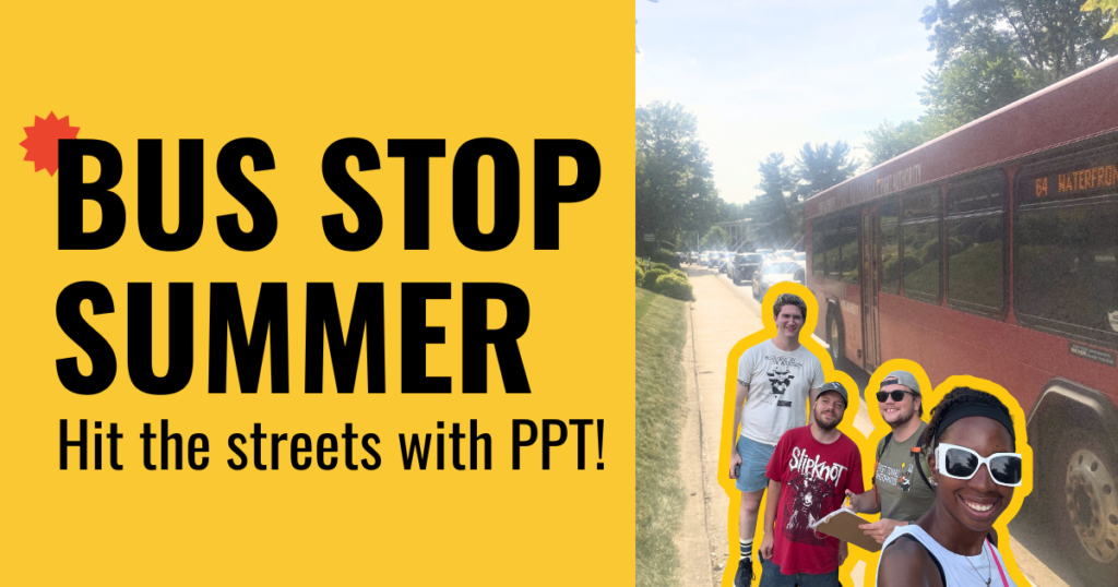 Image Description: PPT members highlighted in yellow, on a glowy background of a bus stop on a summer day. Next to them is the phrase “Bus stop summer: hit the streets with PPT!”
