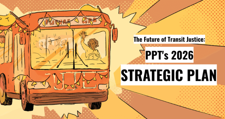 Image Description: An illustration of an orange and yellow bus, decked out with smiling passengers, and with its destination sign reading “future”. To its right, in front of starbursts and cartoon stripes, is black and white text reading “The Future of Transit Justice: PPT’s 2026 Strategic Plan”.