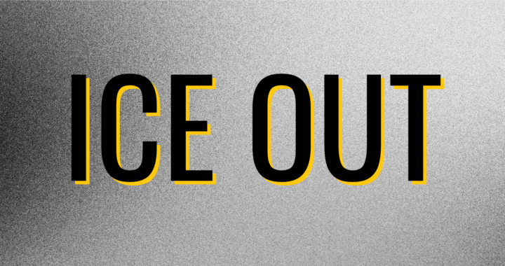 Image Description: Black and yellow text reads “ICE OUT” on a pixelated gray and black gradient background.