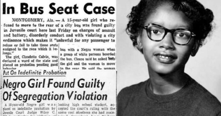 Image description: photo of a newspaper clipping sourced from Claudette Colvin and published in a Guardian profile in 2021. There are two headlines reading “Girl, 15, Guilty in Bus Seat Case” and “Negro Girl Found Guilty of Segregation Violation,” as well as a photo of a young Black girl with tortoiseshell glasses, short curly hair wearing a sweater looking into the camera and lightly smiling.