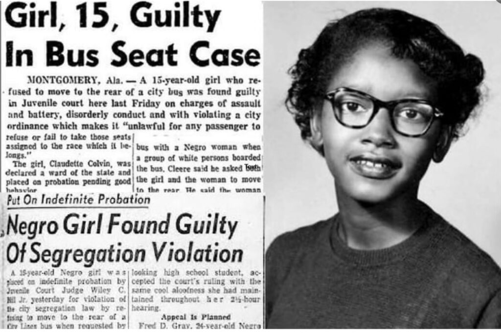 Image description: photo of a newspaper clipping sourced from Claudette Colvin and published in a Guardian profile in 2021. There are two headlines reading “Girl, 15, Guilty in Bus Seat Case” and “Negro Girl Found Guilty of Segregation Violation,” as well as a photo of a young Black girl with tortoiseshell glasses, short curly hair wearing a sweater looking into the camera and lightly smiling.