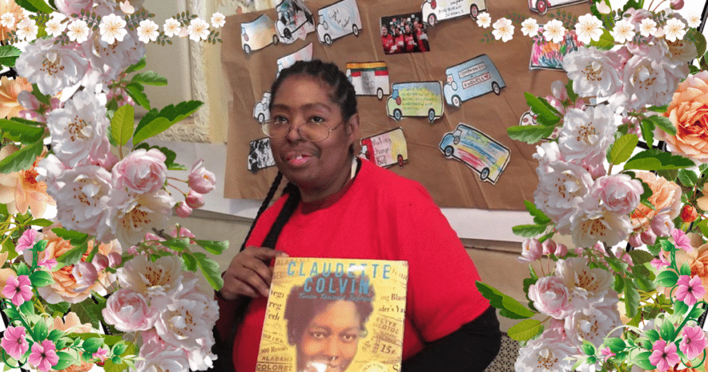 Image Description: Photo of Ms. Lisa Gonzalez wearing a red PPT shirt, long black braids and glasses looking at the camera and holding a picture book of Claudette Colvin, with coloring sheets of buses in the background. Her photo is surrounded by peonies and other flowers.