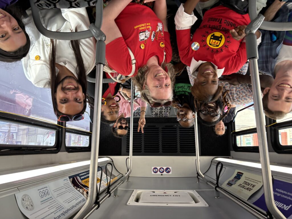 Image Description: 10 PPT members and transit advocates on a PRT bus smile at the camera, one holding up a peace sign. Some are wearing red PPT shirts.