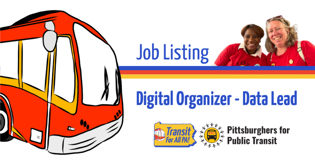 Please email a resume, cover letter, and writing/work samples to Dan Yablonsky, PPT/T4APA’s Digital Organizing Director, at dan@pittsburghforpublictransit.org. To ensure your email is received, please include “PPT Digital Organizer – Data Lead” as the subject line. References will be asked for candidates who advance in the process. Candidates will only be contacted if our hiring team chooses to pursue an interview.