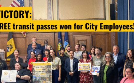 Image Description: A group of advocates stands with Pittsburgh City Councilmembers inside council chambers. They smile and hold Transit for All PA! and Week Without Driving PGH signs, as well as a large proclamation bearing the City seal. Black and yellow text reads “VICTORY: FREE transit passes won for City Employees!” UPDATE: The PRTner Pass […]